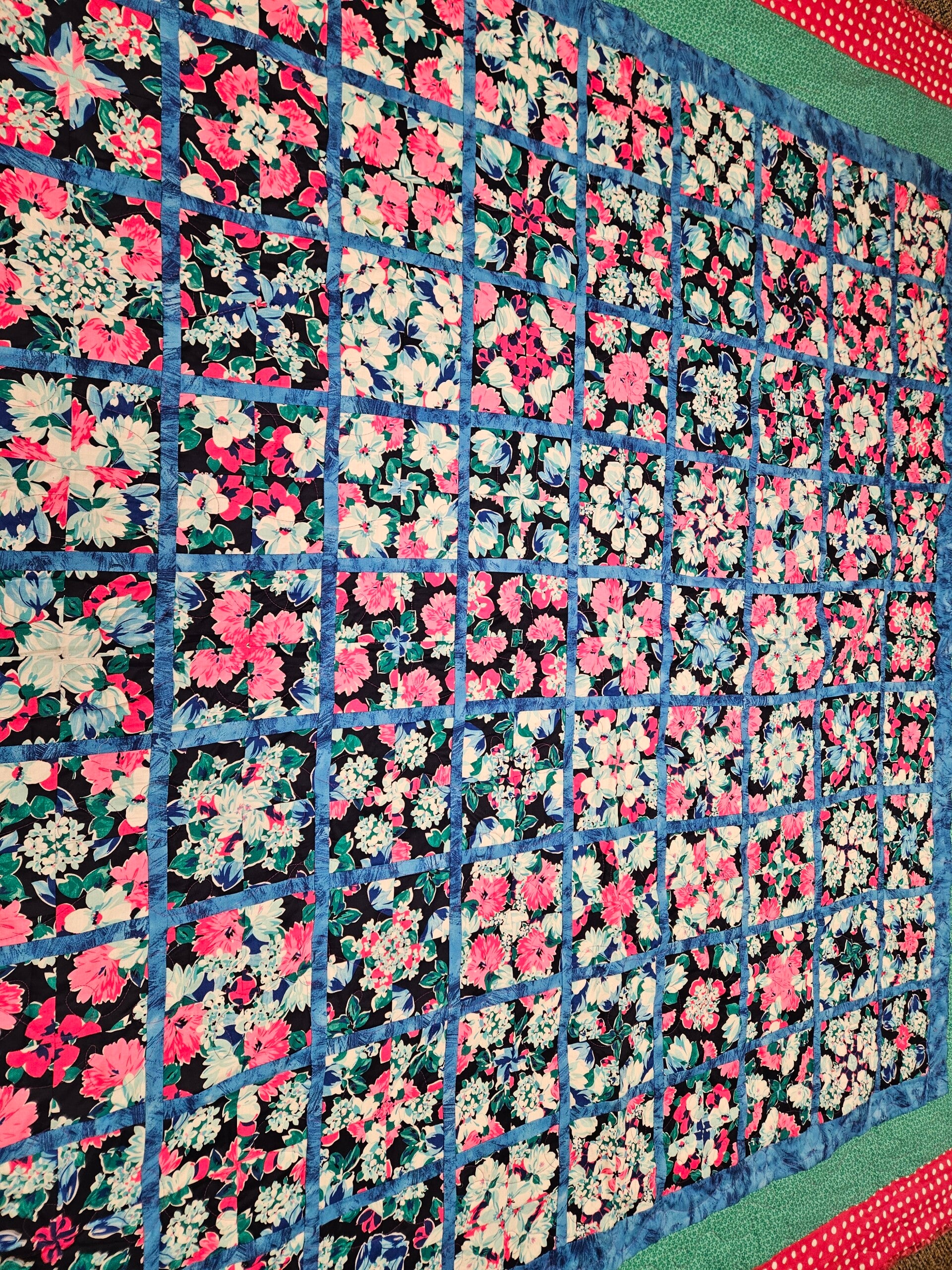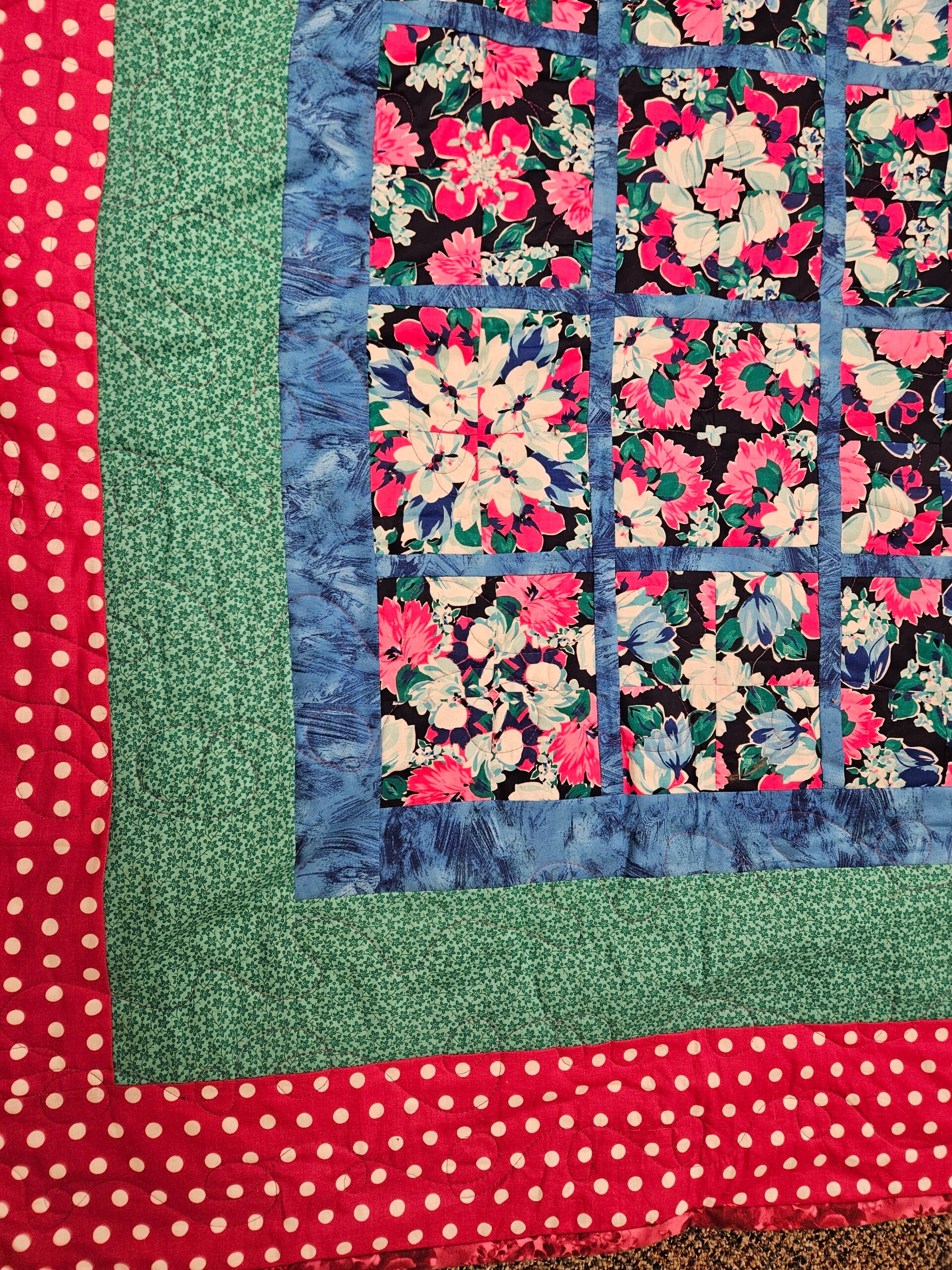 90 x 90 inches wide. Machine pieced and machine quilted. 80/20 Hobbs batting, cotton blend backing. Can be washed and dried with no problem. Beautiful colors.